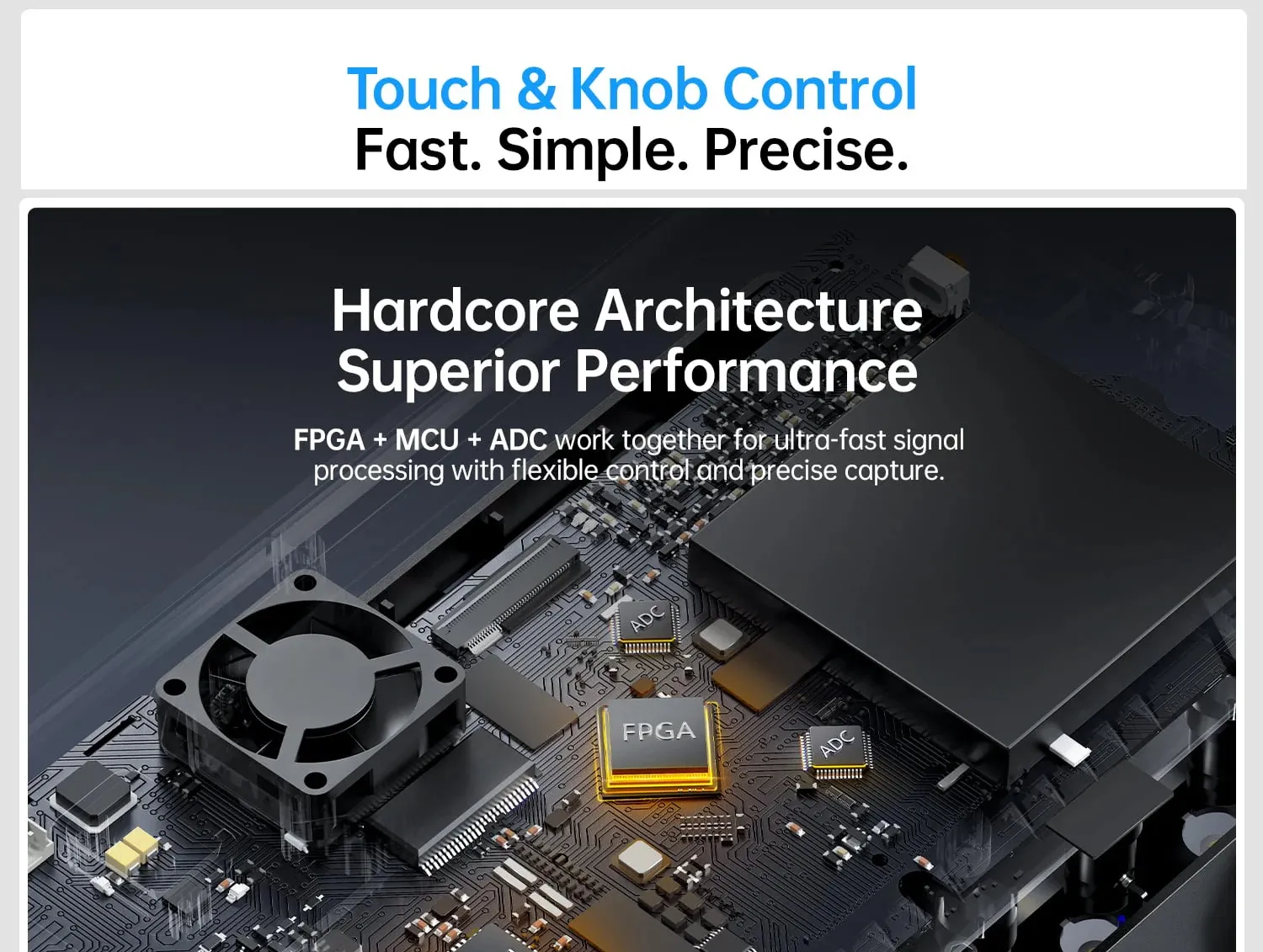 Arquitectura FPGA + MCU + ADC - Garantiza procesamiento de señales a alta velocidad y rendimiento estable.
