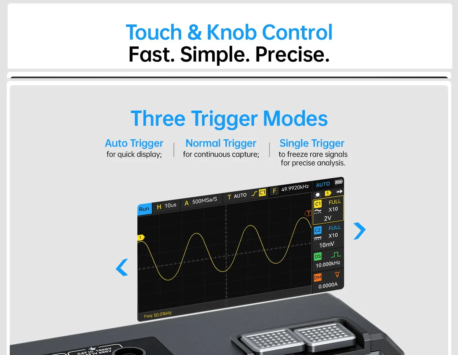 Modos de Disparo Automático / Normal / Único - Captura flexible de señales para cada necesidad de prueba.