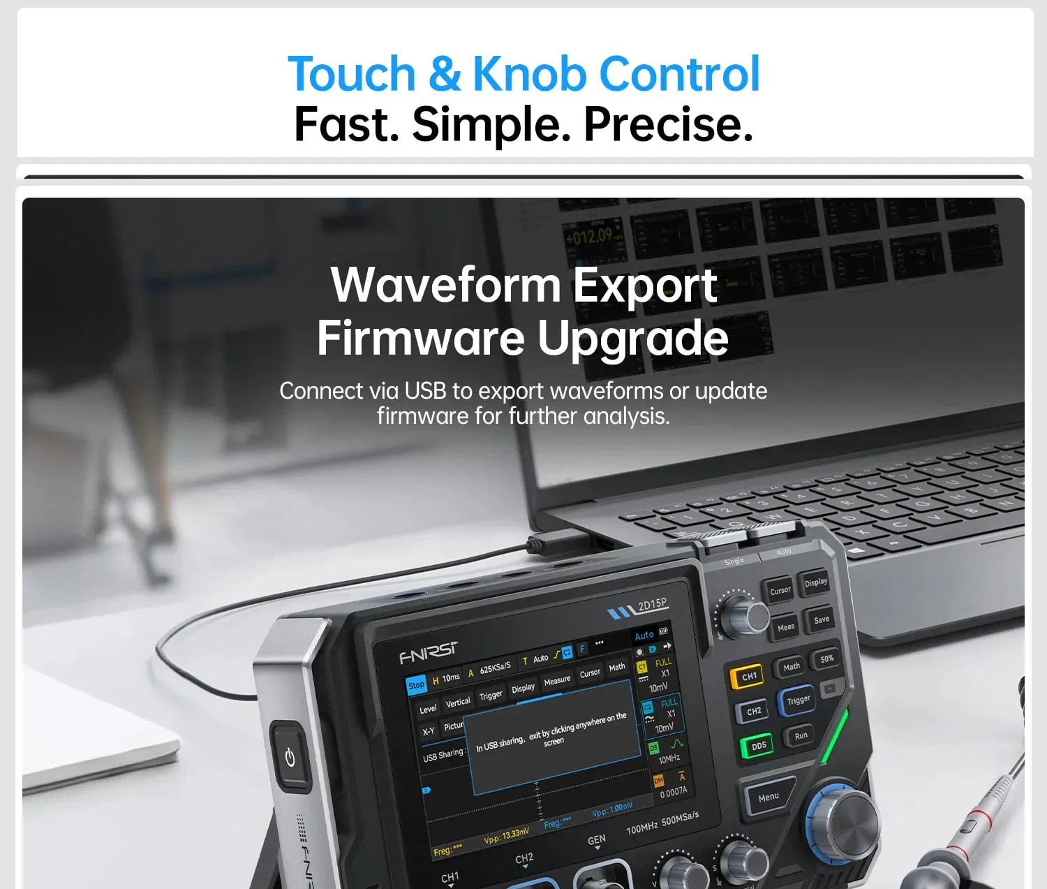 El FNIRSI 2D15P combina botones físicos con una pantalla táctil capacitiva de 4.3” Ofrece muestreo de 500 MS a/s, ancho de banda de canal único de 100 MHz (50 MHz doble canal) y profundidad de memoria de 10k 1M . Las características incluyen pantalla en escala de grises de 128 niveles, captura de forma de onda a 1200 fps, funciones matemáticas, 18 mediciones automáticas, generador de forma de onda de 10 MHz y multímetro True RMS de 19999 cuentas que soporta pruebas de voltaje, corriente, resistencia, capacitancia, diodo y continuidad.