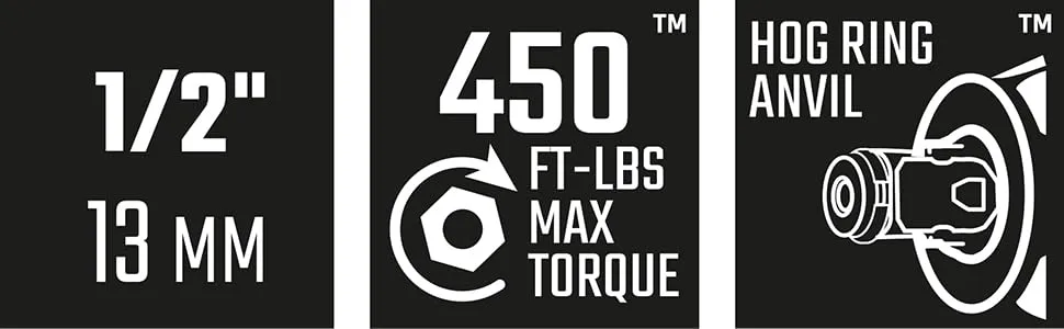 La llave de impacto de 7.5 amperios de 1/2 pulgada tiene una calificación de par máximo de 450 pies-libras.(RECOMENDADO PARA SACAR DAMPERS QUE TIENEN TORQUES ALTOS) La llave de impacto CRAFTSMAN también viene con un yunque de anillo de cerdo que permite la velocidad y la facilidad de quitar TUERCAS grandes.